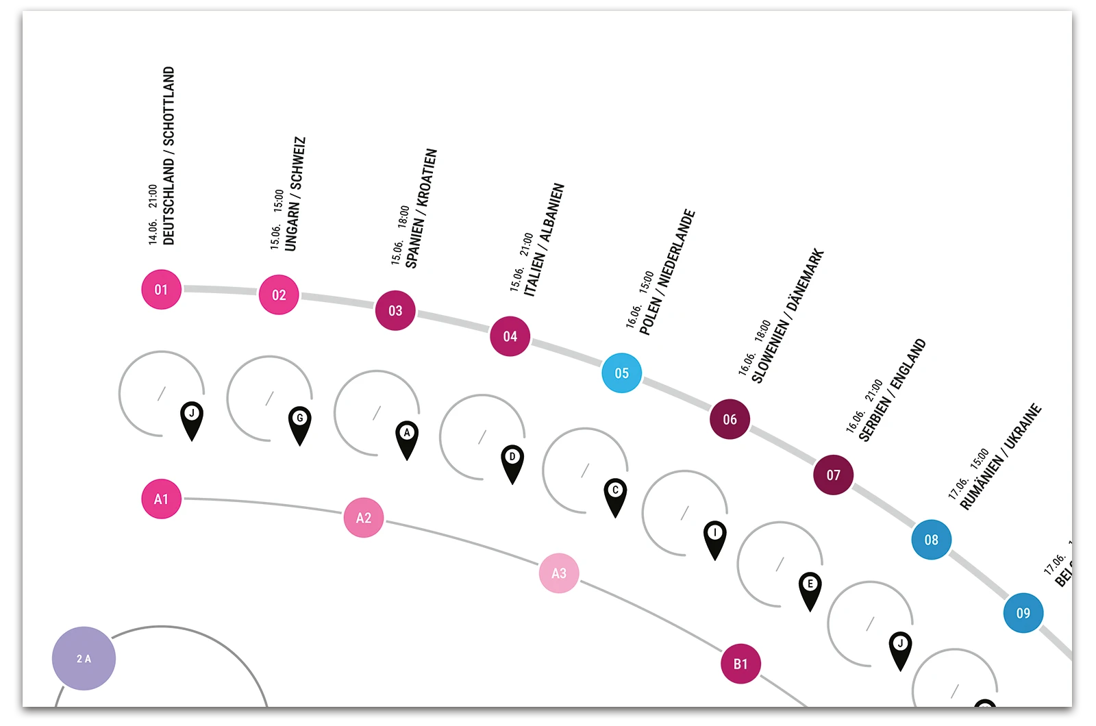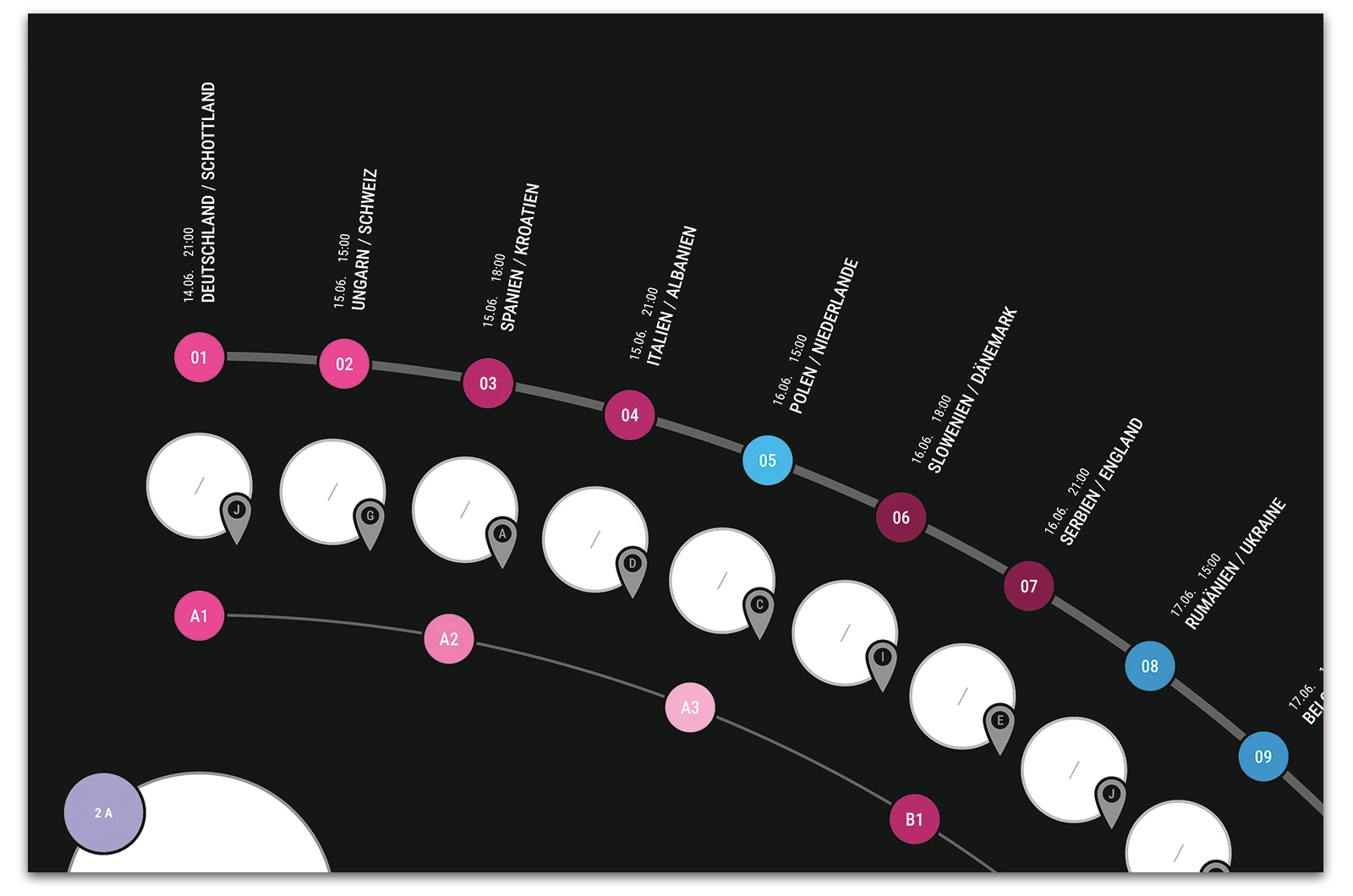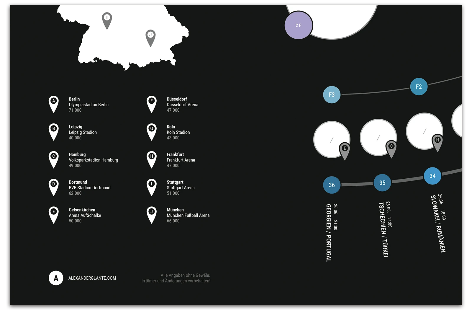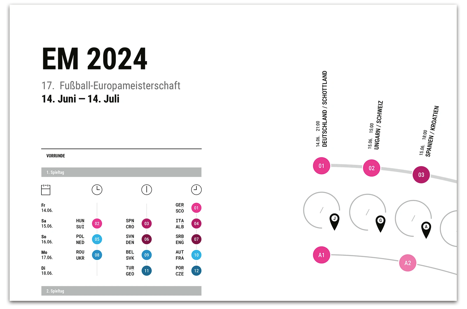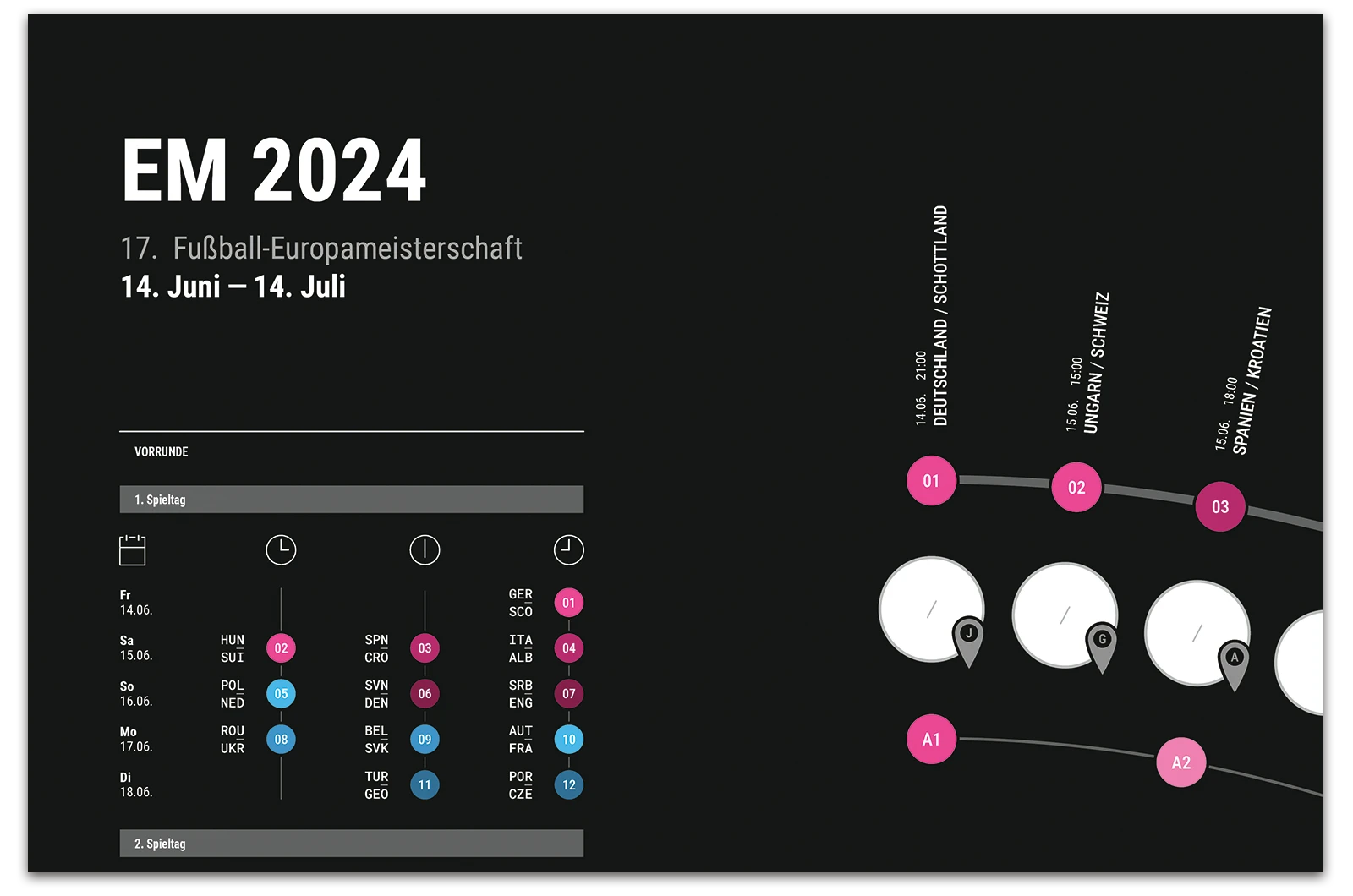 A project on the topic of infographics, where a fixture list for the 17th UEFA European Football Championship 2024 was created. This fixture list provides an overview of all matches taking place along with the times, as well as a geographical map showing the locations of the matches. The respective match results can be entered into the semi-circular graphic.