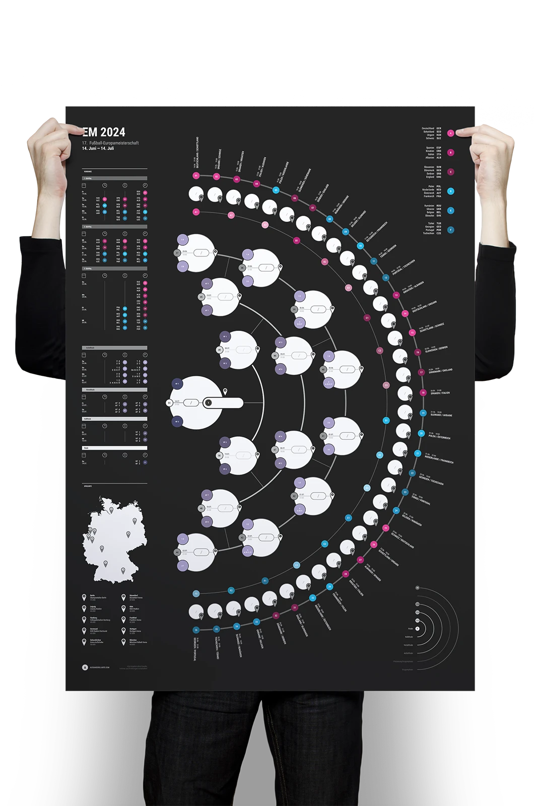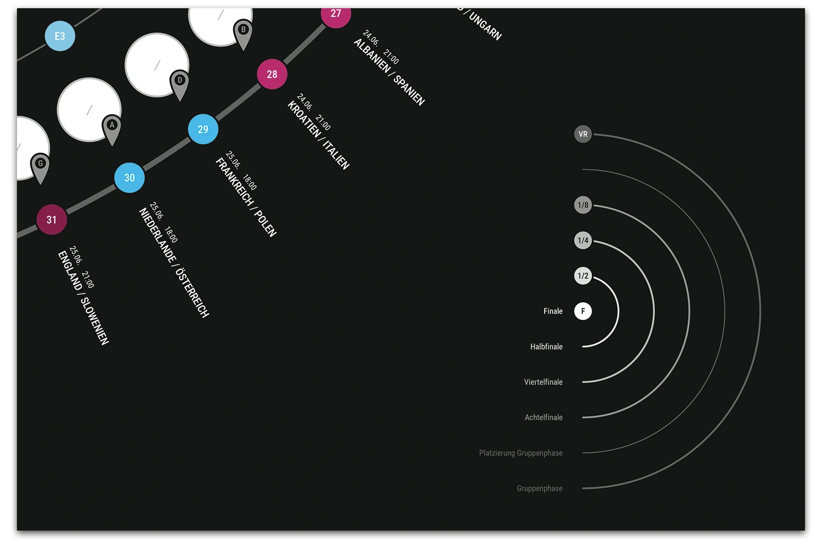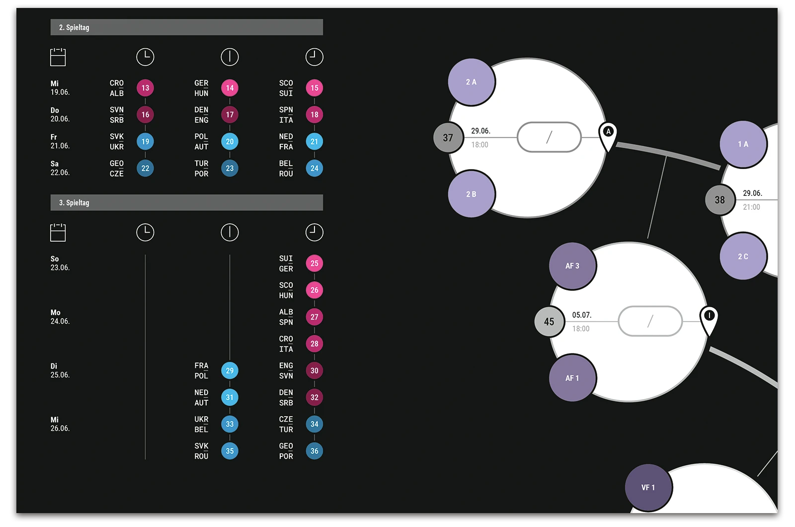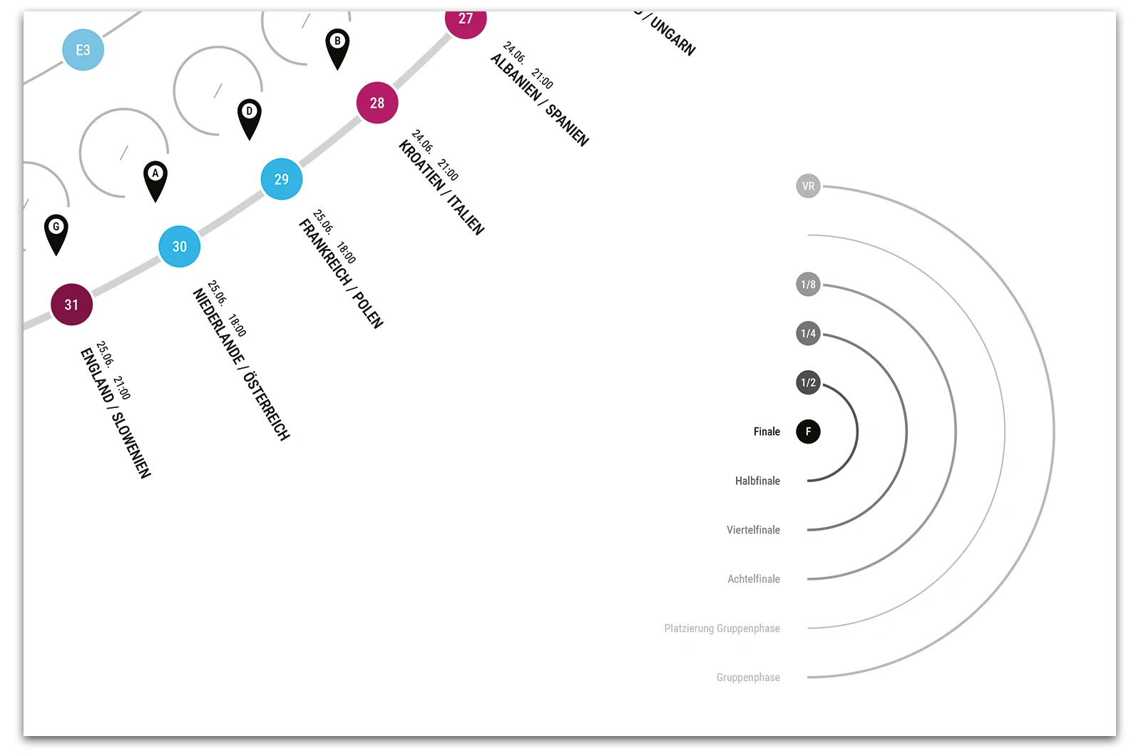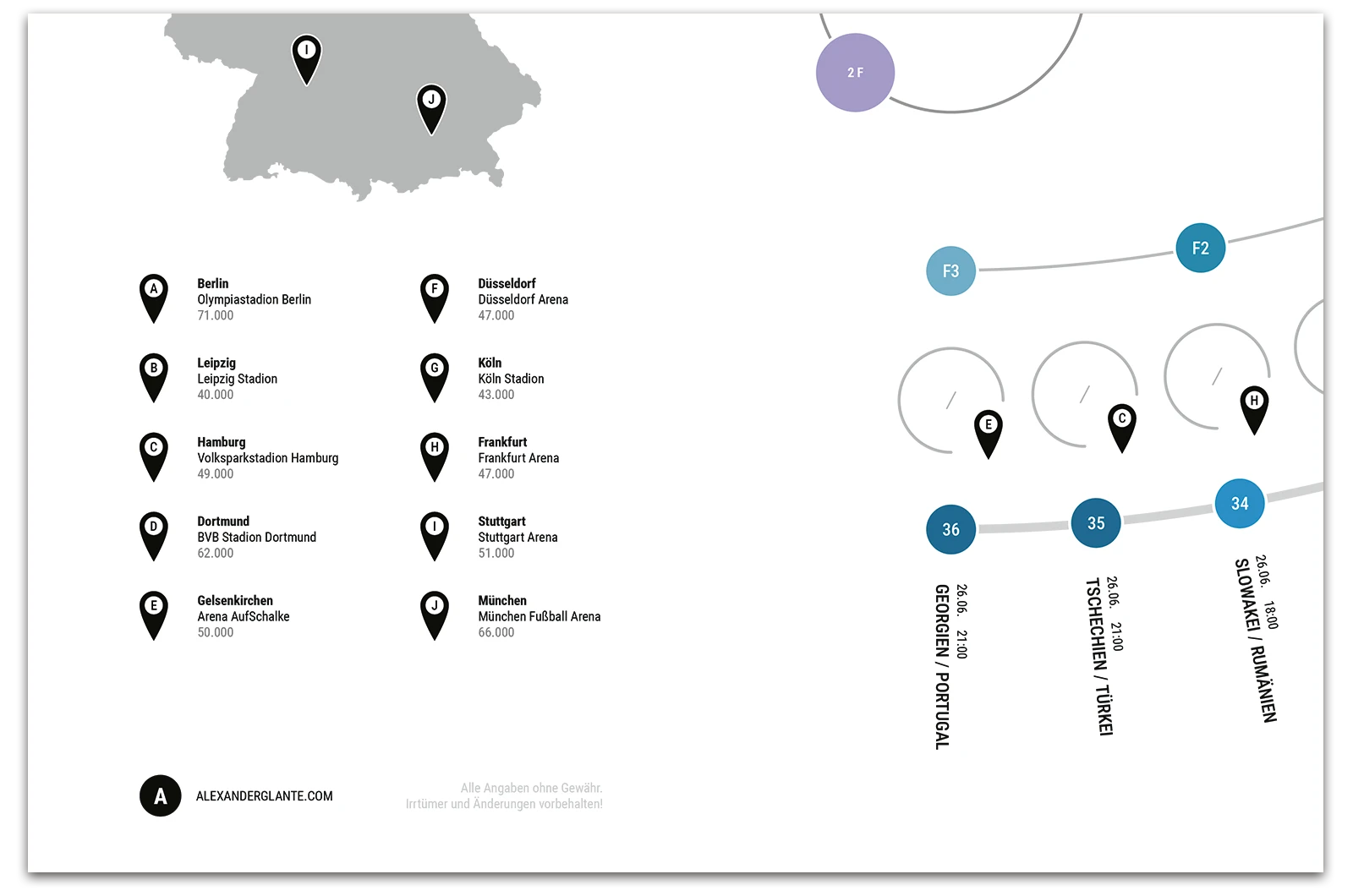 A project on the topic of infographics, where a fixture list for the 17th UEFA European Football Championship 2024 was created. This fixture list provides an overview of all matches taking place along with the times, as well as a geographical map showing the locations of the matches. The respective match results can be entered into the semi-circular graphic.